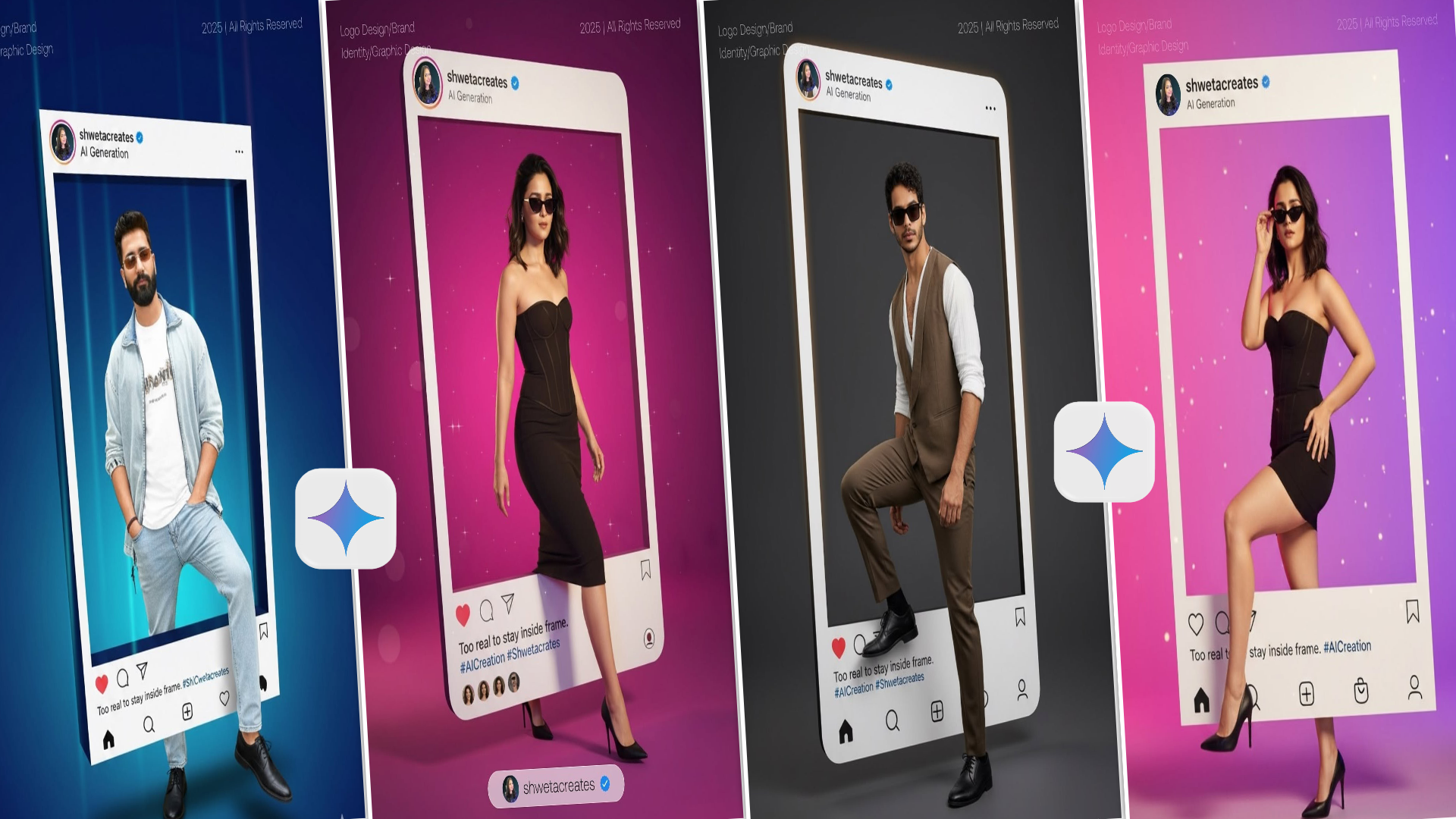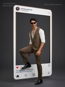 A hyper-realistic portrait of the uploaded stylish young man inside a giant Instagram post frame that fills most of the image. His confident pose one leg stepping outward creates a powerful 3D illusion. He wears dark sunglasses and sleek shoes, projecting authority and trendiness. The Instagram frame is sleek with username shwetacreates, verified badge, display name “Al Generation”, caption: “Too real to stay inside frame. #AlCreation #M4editorofficial”. The background is minimal and classy: a matte dark charcoal-gray backdrop with subtle golden edge glow around the Instagram frame, giving it a premium, editorial feel. This creates a clean, bold, and instantly viral composition..