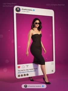 A hyper-realistic portrait of the uploaded stylish young woman inside a giant Instagram post frame. She wears her black dress, sunglasses, and sleek shoes, radiating bold confidence. Her pose is casual yet powerful, with one leg stepping outward from the Instagram frame in a surreal 3D effect. The Instagram frame fills most of the composition with username shwetacreates, verified checkmark, display name “Al Generation”, caption: “Too real to stay inside frame. #AlCreation #M4editorofficial”, and realistic icons. The background bursts with viral energy a radiant hot pink and electric purple gradient, softly glowing behind the frame. Subtle sparkles and faint bokeh circles float in the background, adding movement and viral appeal without overpowering her. Balanced cinematic light makes her outfit and the 3D frame illusion the focus.